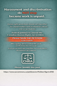 A federal petition calls on Parliament to amend the Canadian Human Rights Act so volunteers, interns, trainees, and other unpaid individuals working under federal jurisdiction are explicitly protected from discrimination and harassment.
