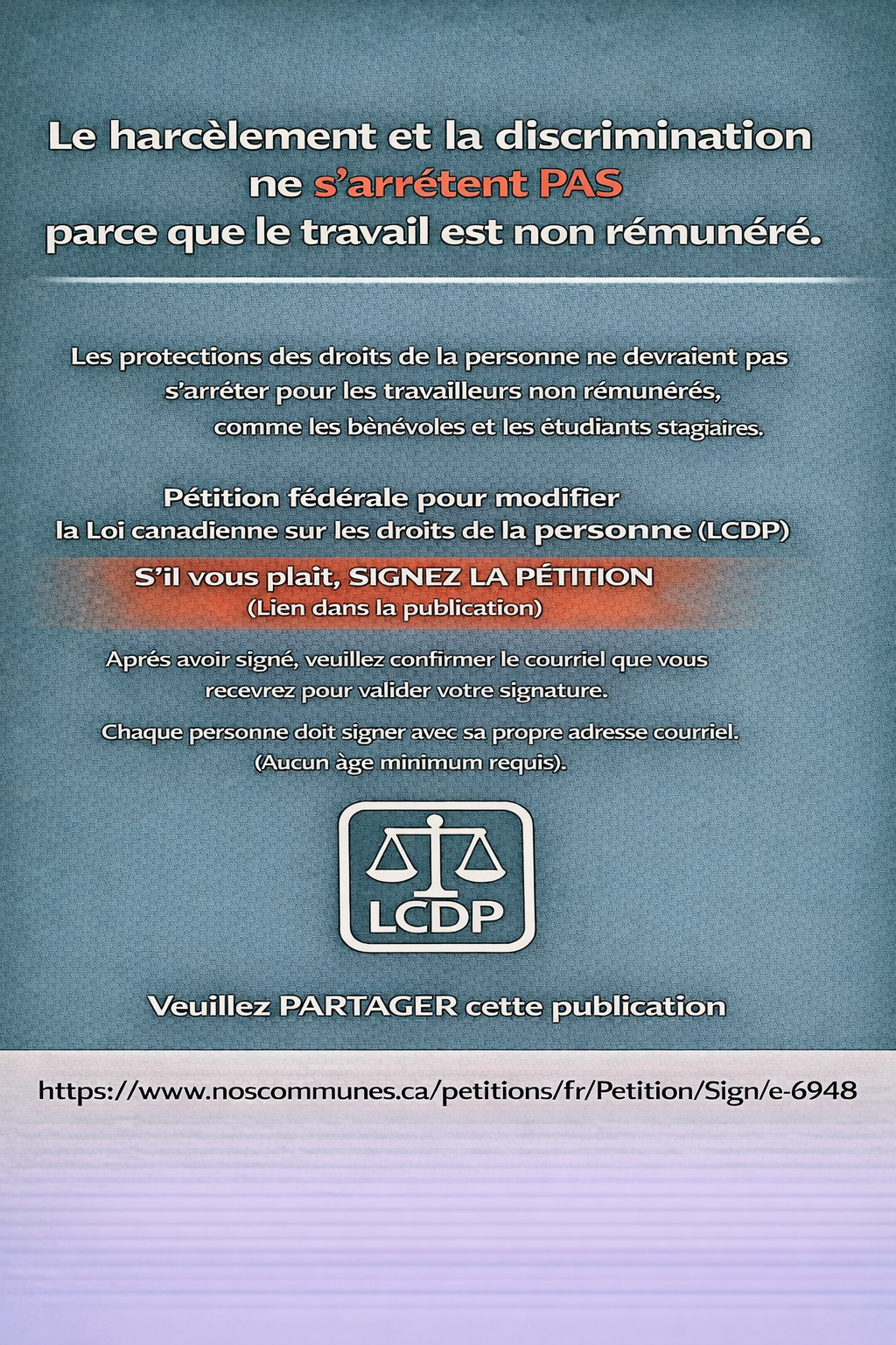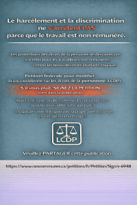 Une pétition fédérale demande au Parlement d’amender la Loi canadienne sur les droits de la personne afin que les bénévoles, stagiaires, étudiants coop et autres travailleurs non rémunérés relevant de la juridiction fédérale soient clairement protégés contre la discrimination et le harcèlement.